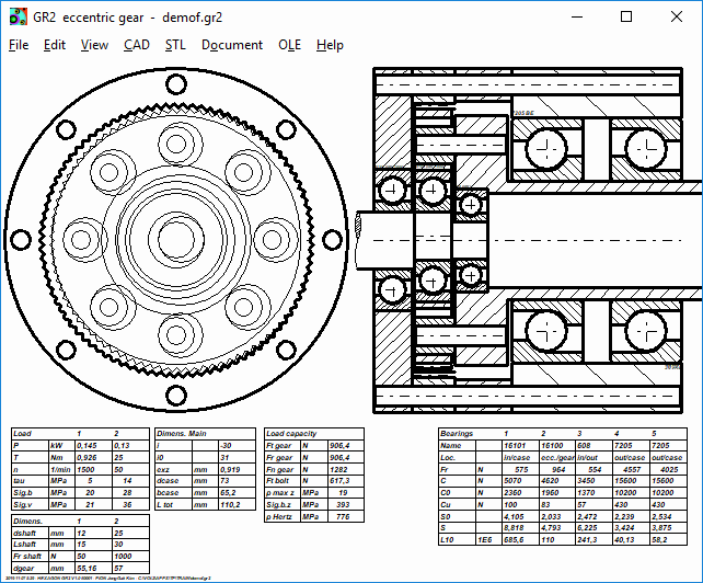 Both, drive shaft and output shaft require two roller bearings. One roller bearing of the drive shaft is bedded in the output shaft. The fifth roller bearing is needed between eccentric shaft and planetary gear. The GR2 software is supplied with databases of groove ball bearings, angular contact ball bearings, cylindrical roller bearings, tapered roller bearings, needle roller bearings and others.