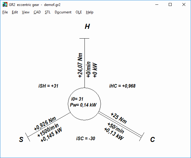 An eccentric gear can be calculated and displayed like a planetary gear. Sun gear S is the eccentricity of the drive shaft, Carrier C is the output shaft. Hollow wheel H is the ring gear.