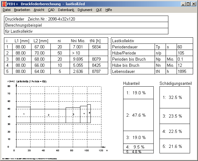 Wenn Hub und Lastspielzahlen nicht konstant sind, sondern periodisch schwanken, kann man ein Lastkollektiv definieren. FED1+ berechnet dann die Lebensdauer der Feder aus dem Lastkollektiv. Eingabewerte für die Lastanteile sind die Federlängen L1 und L2 sowie die Lastspielzahl (Anzahl der Hübe im Lastkollektiv je Periode) und die Periodendauer.