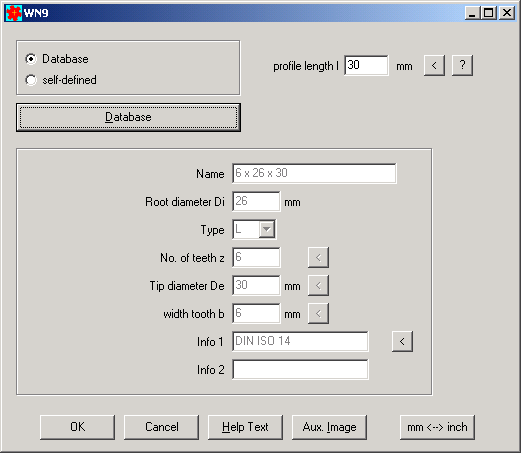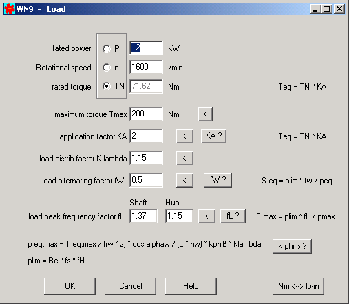 WN9 includes calculation of load capacity according to Niemann Machine Elements 1 (2005). Material data can be seleceted from integrated material database. For input of application factor, load distribution factor, load alternating factor and peak load factor, WN9 suggests values or provides auxiliary pictures.