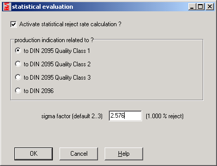 Like in FED1+ and FED2+, FED6 now calculates reject rate for self-defined small tolerances. At "Edit -> Statistics" you have to enter the average reject rate for production to a defined quality class. This mainly depends on the machine where the springs are produced, i.e. reject rate may be 1% for tolerances to DIN 2095 quality class 1. Then select quality class 1 and enter Sigma = 2.576.