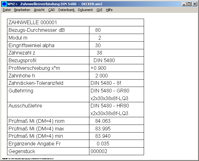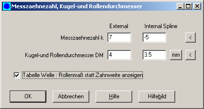 In der Tabelle nach DIN 5480 wird für die Zahnwelle als Prüfmaß die Zahnweite und für die Nabe das Rollenmaß ausgegeben. Unter "Bearbeiten->Messen" kann man jetzt konfigurieren, daß für die Zahnwelle ebenfalls das Rollenmaß in der CAD-Tabelle ausgegeben wird.