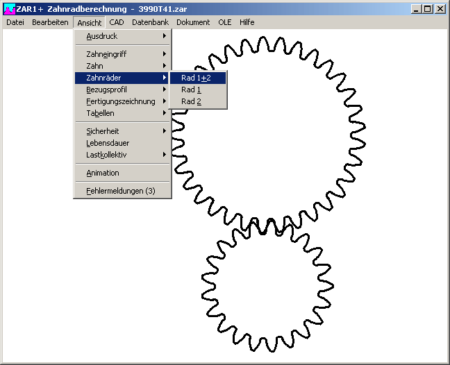 Unter "Ansicht->Zahnräder->Rad 1+2" wird eine Zeichnung des berechneten Zahnradpaars angezeigt. Bisher gab es dort nur Zeichnungen der einzelnen Zahnräder.