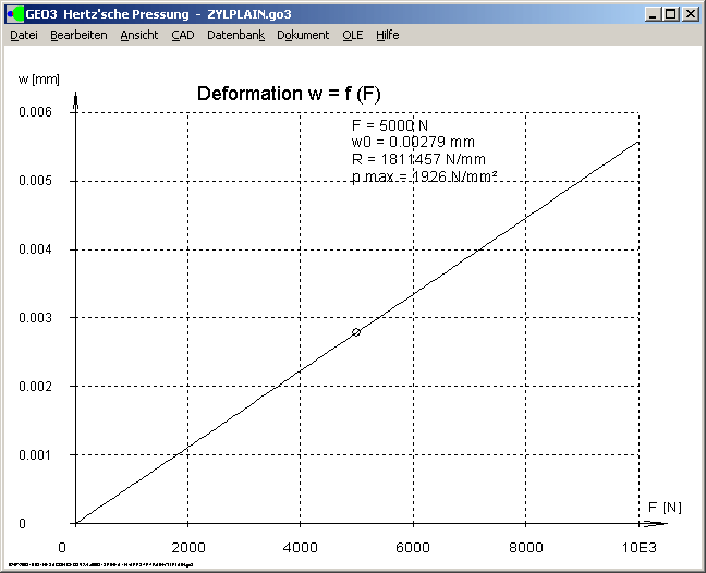 Für die Paarung Zylinder-Zylinder und Zylinder-Ebene wurde bisher nur das Maß a1 berechnet. Jetzt wird daraus auch die Verformung w und die Federrate R berechnet. Für diese Paarungen steigt die Deformation linear mit der Kraft an, die Federrate ist konstant, unabhängig von der Pressung.
