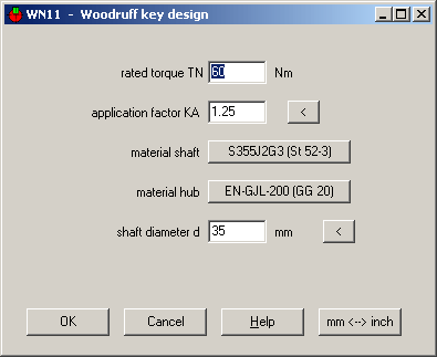 New WN11 Software calculates load bearing capacity of Woodruff key joints according to DIN 6892. This standard is specified for parallel keys, but can also be used for Woodruff keys, if load-bearing length and load-bearing height are replaced by load-bearing areas of shaft groove, hub groove and Woodruff key.