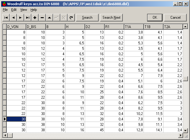 WN11 includes a database with dimensions of Woodruff keys according to DIN 6888. Database may be extended and modified by the user.