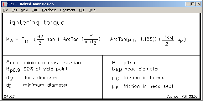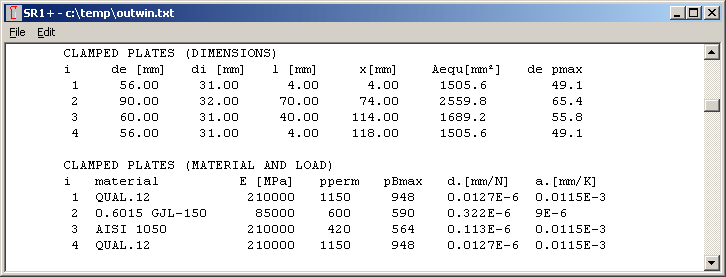 SR1 now considers this rule for the case that dwa is lower than the calculated value of the reference cylinder for calculation of elastic resilience. External diameters for calculation of surface pressure are now listed in printout under "de pmax". Maximum surface pressure pmax was renamed into "pBmax" (for maximum operating load FM+FSA according to VDI2230:2003).
