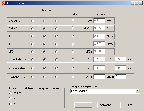 Bei Drehfedern mit abgebogenen Schenkeln war die Toleranz für den Biegeradius falsch angezeigt worden: die Toleranz beim Abbiegeradius geht nur ins Plus, angezeigt wurden bislang +/- Toleranzen.