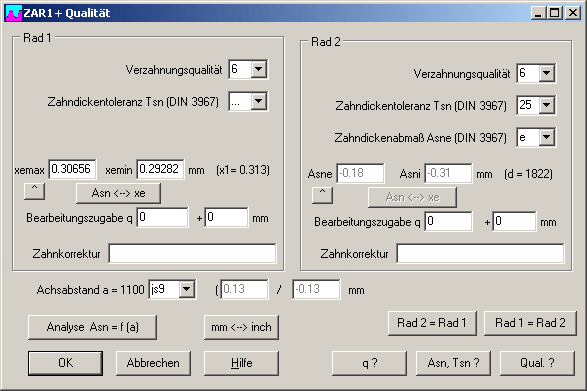 In der neuesten Version von ZAR1+ kann man alternativ zu den Zahndickenabmaßen Asne und Asni die Erzeugungsprofilverschiebungsfaktoren xemax und xemin eingeben. Asn und xe werden umgerechnet: