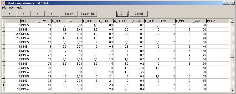 Zylinderschrauben mit Schlitz Form1 und Form2 wurden zusammengefasst in einer Datenbank. In dem neuen Datenbankfeld "TYP" ist Form 1 oder Form 2 definiert.