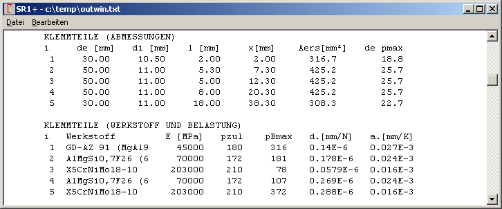 In SR1 wird diese Vorschrift nun für den Fall berücksichtigt, daß dwa einen kleineren Wert ergibt als der berechnete Durchmesser des Ersatzzylinders für die Berechnung der elastischen Nachgiebigkeit. Im Ausdruck werden die Außendurchmesser für die Berechnung der Flächenpressung aufgelistet unter "de pmax". Die maximale Flächenpressung pmax wurde umbenannt in pBmax (für maximale Betriebslast FM+FSA laut Definition in VDI2230:2003).
