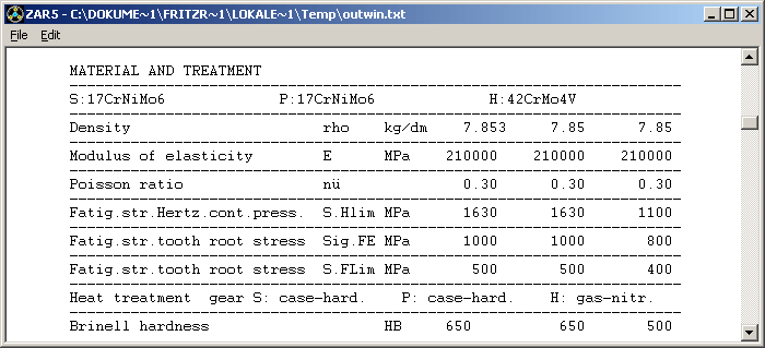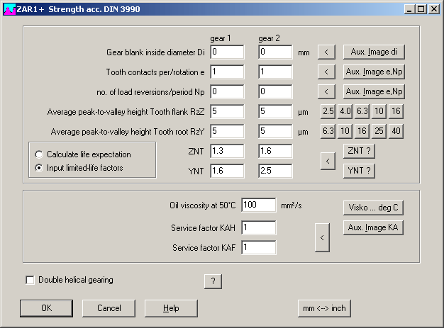 Concerning life time factors YNT and ZNT, calculation method in ZAR1+ and ZAR5 differs from ISO 6336 and DIN 3990. According to DIN and ISO, you have to determine the life time factors YNT and ZNT from the required life time. If life time must be infinite (fatigue life), YNT and ZNT are set 1.0. ZAR1+ and ZAR5 calculate reverse: if calculated safety coefficients SH and SF are higher than 1, gear is fatigue-resistant. If SH and SF are lower than 1, program calculates life expectancy.
