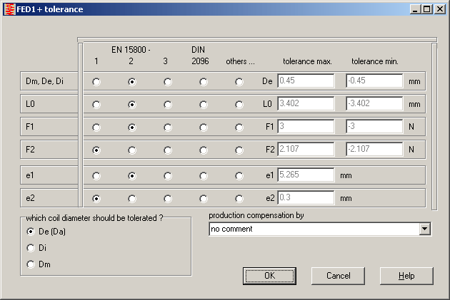 New version of FED1+ and FED6 lets you select different quality grade for loads F1 and F2 as well as for parallel and angle deviation e1 and e2. Quality grades are listed in production drawing according to EN 15800, which replaces form in DIN 2099-1. Coil ratio w and stress correction coefficient k also have been added to the production drawing.