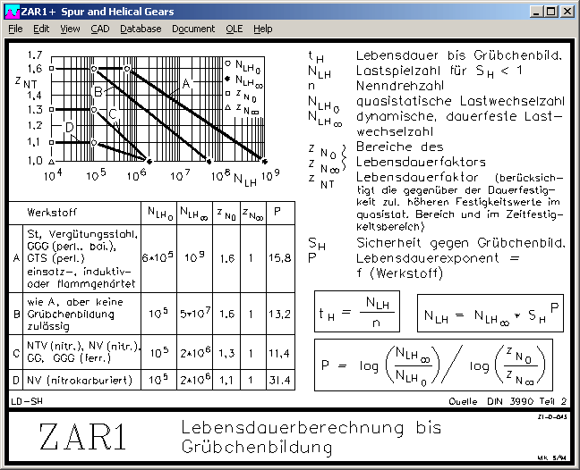 Bezüglich der Lebensdauerfaktoren YNT und ZNT unterscheidet sich die Vorgehensweise in ZAR1+ und ZAR5 von ISO 6336 bzw. DIN 3990. Während nach DIN und ISO aus der Lebensdauer Diagrammwerte für YNT und ZNT ermittelt werden, geht ZAR1+ und ZAR5 den umgekehrten Weg: Bei Sicherheit S>=1 ist das Zahnrad dauerfest, und bei SH und SF kleiner 1.0 wird die Lebensdauer berechnet.