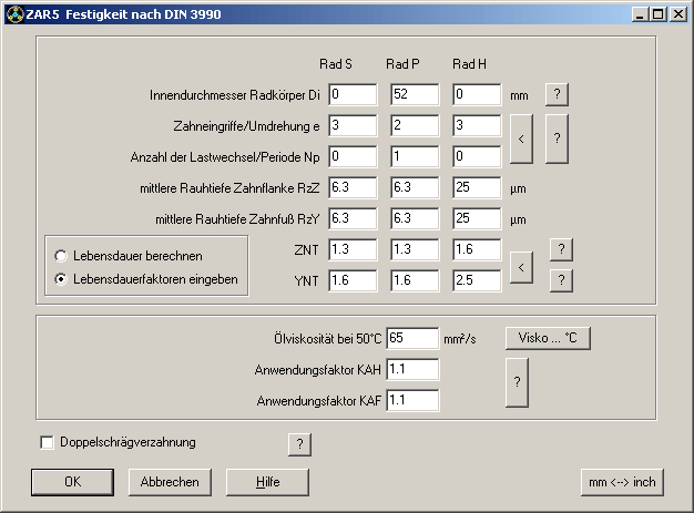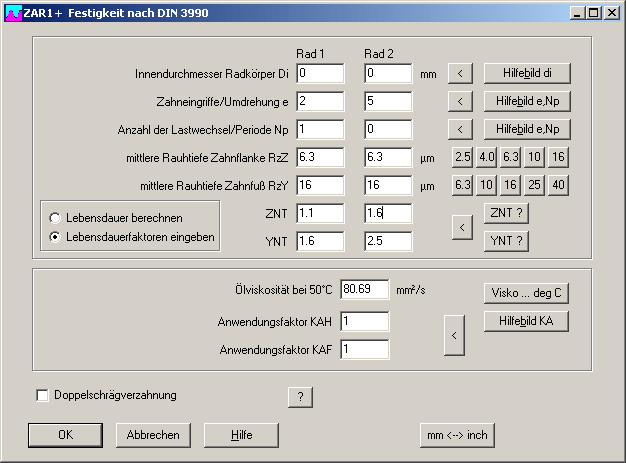 Diese Lösung ist praktisch, aber nicht konform zu DIN und ISO, weil man YNT und ZNT nicht eingeben kann. Deshalb gibt es jetzt die Möglichkeit, zwischen beiden Methoden zu wählen. Wenn Sie YNT und ZNT eingeben, beziehen sich SH und SF auf die Zeitfestigkeit, die Lebensdauer kann in dem Fall nicht berechnet werden.