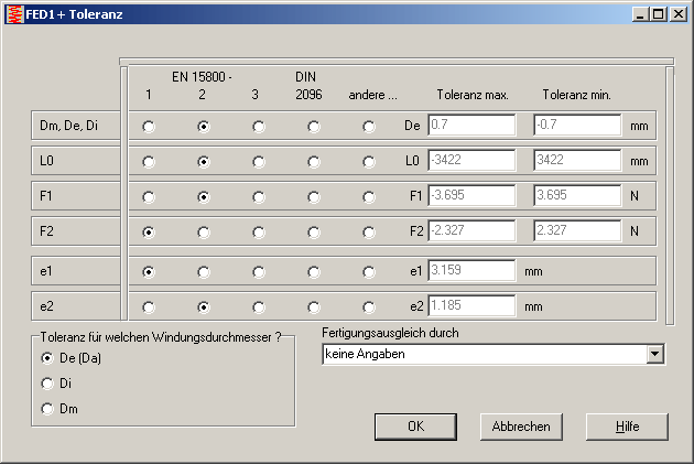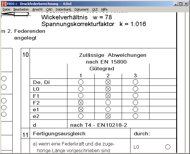 In der neuesten Version von FED1+ und FED6 kann man für die Federkräfte F1 und F2 einen unterschiedlichen Gütegrad wählen, ebenso für die Parallelitäts- und Winkligkeitstoleranzen e1 und e2. Die Gütegrade werden in die Fertigungszeichnung gemäß EN 15800 übernommen, welche den Vordruck nach DIN 2099-1 ersetzt. Des weiteren wurden Wickelverhältnis und Spannungskorrekturfaktor in die Fertigungszeichnung nach EN 15800 übernommen.