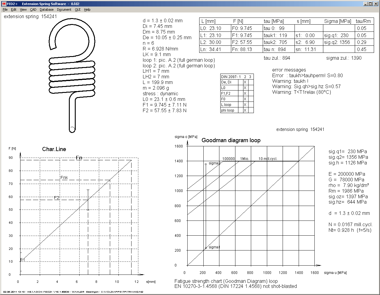 FED2+ draws the Goodman diagram with bending stress of the loops in Quick3 view now, if coiled loops are used. For springs with screwed-in loops or thread bolts or by means of FED2 (without plus), Goodman diagram with shear stress in the coils is drawn, as before.