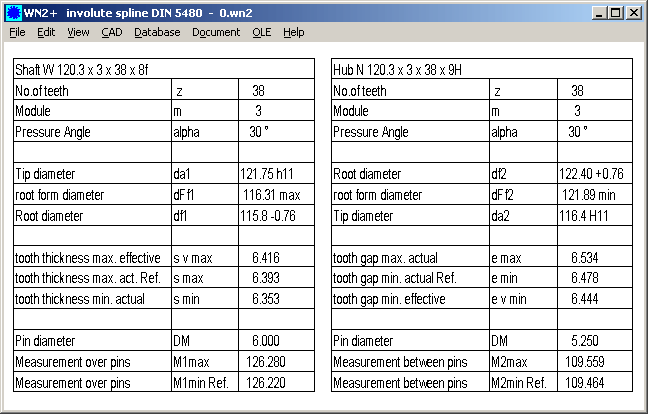 The plus version of WN2 allows you to define non-standard profiles by input of addendum, dedendum and addendum modification coefficients. In case of non-standard profiles, lines "Basic Rack: DIN 5480", "Go-master ring" and "No-go Gauge" are not printed. Another modification: in table DIN 5480:1991, min and max value for over-pin-dimension had to be exchanged.