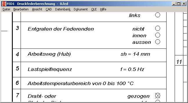 Alternativ zu der bisherigen Fertigungszeichnung kann man eine Zeichnung nach DIN 2099-2:2004 ausgeben (nachdem eine EN-Norm für eine Fertigungszeichnung der Zugfeder noch nicht in Sicht ist). Abweichend von der DIN-Norm wird die Lastspielfrequenz in 1/s statt 1/min angegeben, wie in der EN-Norm für die Druckfeder.