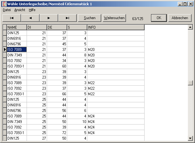 Bei Auswahl einer Scheibe von Datenbank wird anschließend der Werkstoff aus der VDI2230-Datenbank mat_p_1.dbf gewählt statt bisher aus der pressung.dbf. Dadurch wird für die Grenzflächenpressung des Klemmstücks bei St50 (E295) der mehr als 50% höhere Wert aus der aktuellen VDI 2230 übernommen.