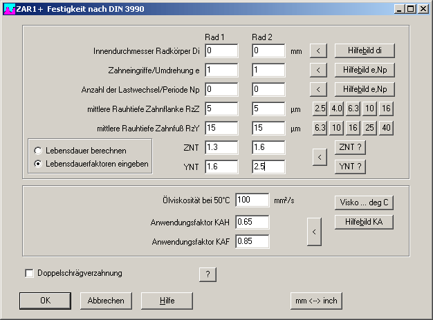 Normalerweise rechnet ZAR1+ die Lebensdauer, wenn SH und SF kleiner als 1 sind. Bei Eingabe der Lebensdauerfaktoren YNT und ZNT wird die Sicherheit für die entsprechende Lebensdauer berechnet. Die Faktoren YNT1, YNT2, ZNT1 und ZNT2 kann man jetzt auch unter "Bearbeiten->Festigkeit->Faktoren" eingeben.