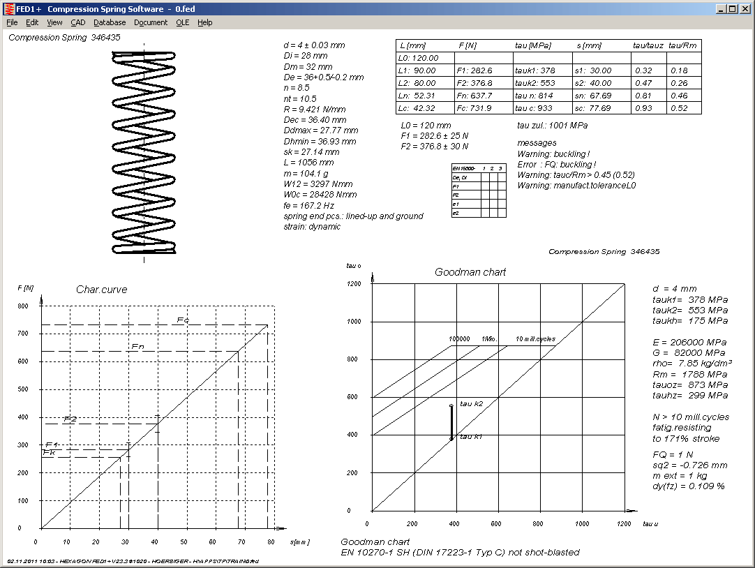 Numerical values of shear modulus and spring load F1, F2 for calculated temperature as well as for min and max value of defined temperature range have been added to the temperature diagrams.