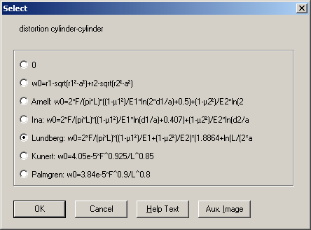 For combinations cylinder-cylinder and cylinder-plain exists no analytic solution for calculation of deformation w0 (and spring rate R). At "Edit->Calculation Method", you can now choose between different approximate computations for calculation of deformation w0 (= approach of both bodies). Besides the former formula of a geometrical calculation from half length of contact axis and radius of cylinder, you can choose calculation according to several formulas according to Arnell, Ina, Lundberg, Kunert and Palmgren. Default setting is 0 (no calculation of w0 and R, only pressure (pmax) and dimensions of pressure rectangle (a) will be calculated).