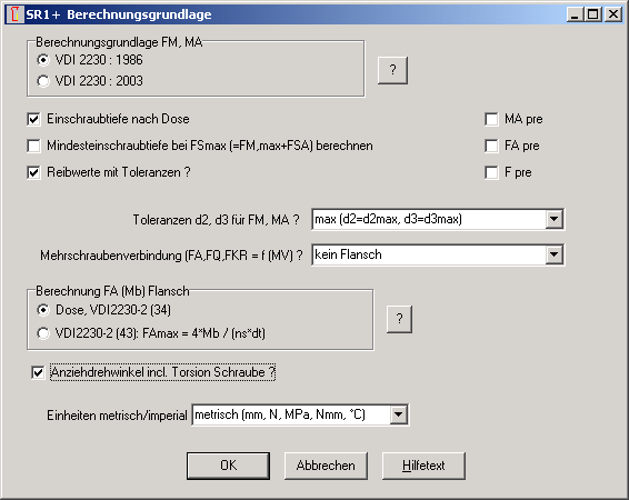 Die Torsion der Schraube beim Anziehen mit Montagedrehmoment MA,max wird jetzt mit ausgedruckt, außerdem kann man unter "Bearbeiten->Berechnungsmethode" konfigurieren, dass die Torsion beim Anziehdrehwinkel berücksichtigt wird. Der Einfluß der Torsion ist allerdings gering, der Anziehdrehwinkel von Schaftschrauben erhöht sich dadurch um ca. 1 – 2 %.