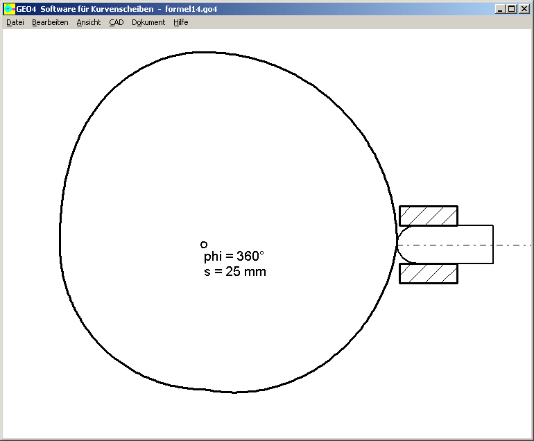 Beispiel für eine Kurvenscheibe mit R=100mm von 0° bis 90°, und R=75mm von 180° bis 270°.