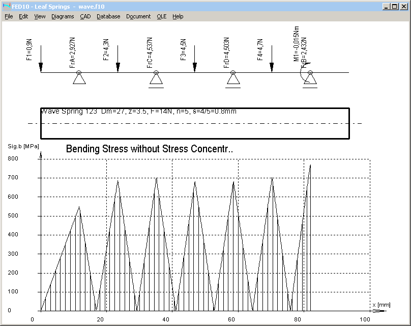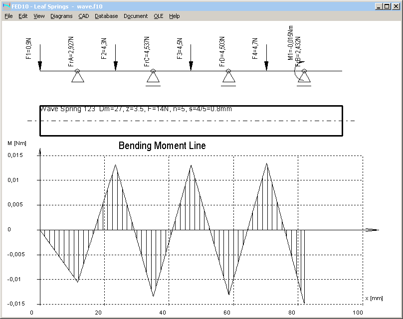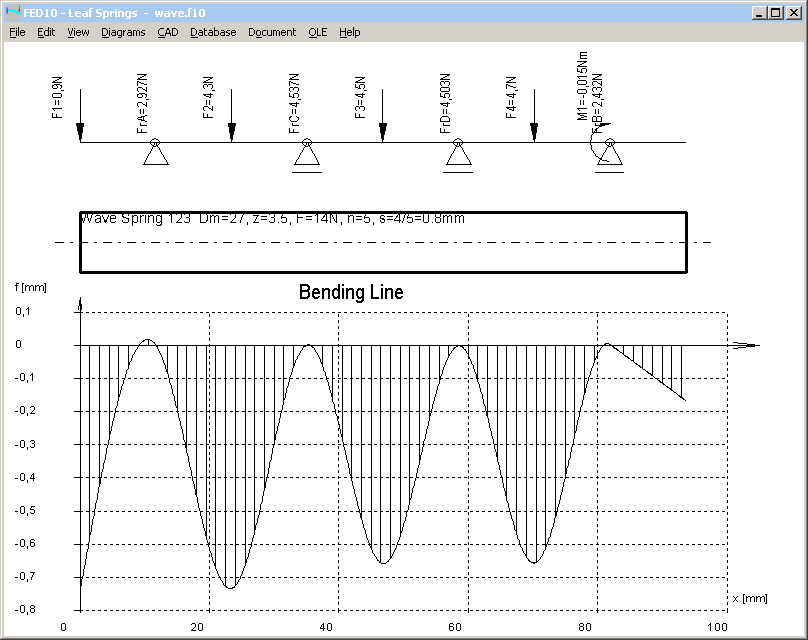 FED10 leaf spring software can be used to calculate one turn of a helical wave spring, in example a coil with 3.5 waves. Spring flat is bedded on 4 bearings. Radial forces are bedding loads of the next coil. Forces have to be distributed so that deflection is equal for all waves. Left is spring end, and on the right side a bending moment of the first wave of the next turn has to be introduced.