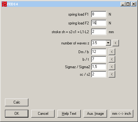 In pre-dimensioning, just input two spring loads and stroke, or only one spring load and deflection, and FED14 calculates dimensions. To vary results, you can edit number of waves, coil ratio, safety sigmaz/sigma2 or ratio of block deflection sc/s2.