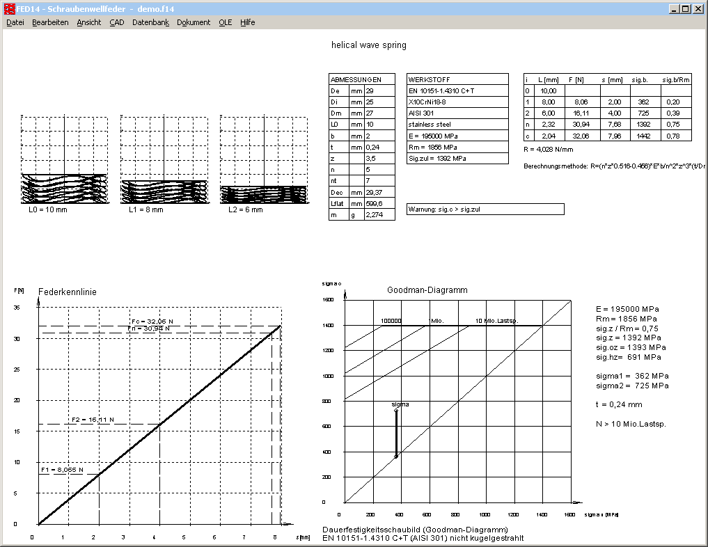 In der Vorauslegung muß man nur 2 Federkräfte und einen Hub, oder eine Federkraft und einen Federweg eingeben, und FED14 berechnet die Abmessungen. Hierbei kann man die Parameter Wellenzahl, Wickelverhältnis, Sicherheit Sigmaz/Sigma2 (Spannung) und sc/s2 (Blockfederweg) nach Bedarf verändern.