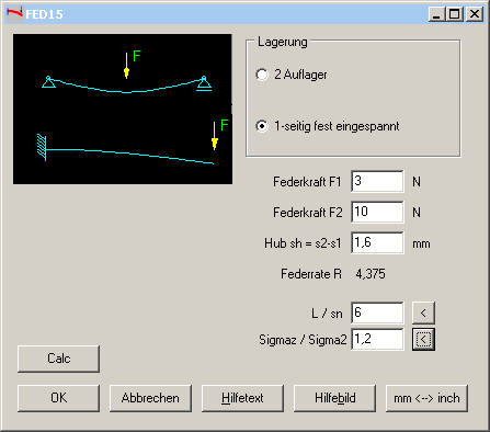Mit FED15 kann man dagegen mit nur wenigen Eingaben sehr schnell einfache Blattfedern berechnen mit konstantem Rechteckquerschnitt und nur einer Federkraft und definierter Federrate. Während in FED10 die Lagerarten "Feste Einspannung" und "Fest/Loslager" mit 2,3, 4 oder 5 Auflagern möglich sind, gibt es in FED15 nur "Feste Einspannung" (z.B. Relaisfeder) oder Fest/Loslager mit 2 Lagerstellen (z.B. Fahrzeug-Blattfeder). Auch die Kraftangriffspunkte sind festgelegt: Bei fester Einspannung am Federende, und bei Fest-/Loslagerung in Federmitte. Dadurch erhält man eine feste Federrate, da nur 1 Federkraft und klar definierte Federwege an der Position des Kraftangriffpunkts. Die Eingabe in FED15 ist ähnlich wie bei den anderen Federprogrammen, mit Federwegen s1, s2 und zugehörigen Federkräften F1 und F2, wogegen die Eingabe der Blattfeder in FED10 vergleichbar ist mit der Wellenberechnung in WL1+ oder der Trägerberechnung TR1.