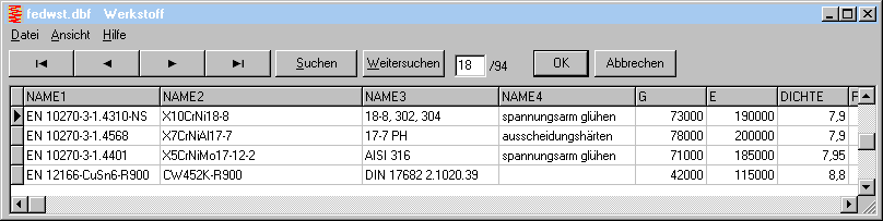 Die Datensatznummer wird jetzt in einem Eingabefeld angezeigt. Dort kann man auch direkt die Datensatznummer eingeben, dann springt der Zeiger an die entsprechende Zeile. Dies verkürzt die Eingabe, wenn man z.B. die Datensatzummern von häufig benötigten Werkstoffen schon auswendig kennt.