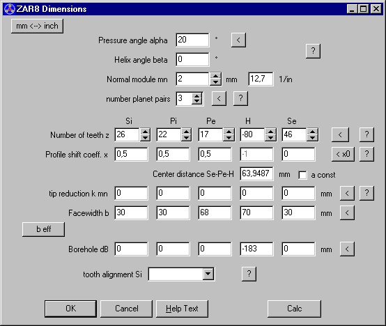 Next enter power or input torque and input speed. You can define number of teeth of the ring gear zH, and ZAR8 calculates dimensions of all gear wheels under consideration of assembly conditions for planetary gear sets.