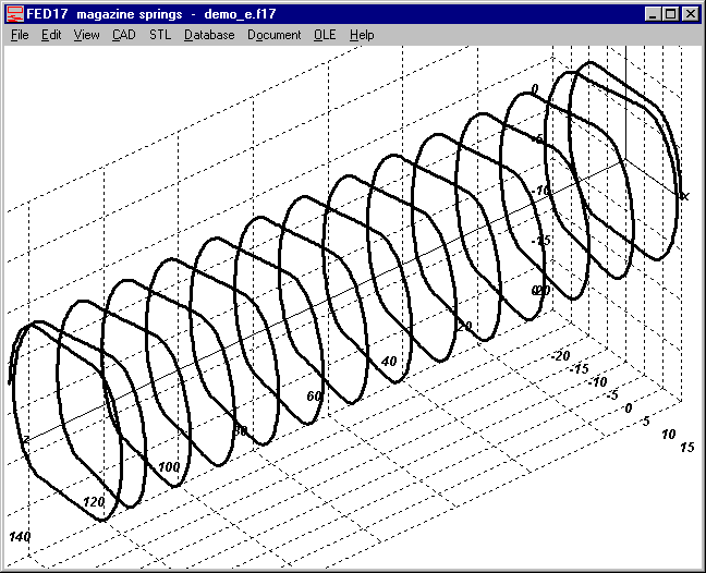 3D centerline has been added in FED7 as drawing on screen, or to be exported as 3D DXF or IGES file to be used with CAD. Because FED7 calculates a compression spring of any form as series of cylindrical spring sections, center line may be less or more disintegrated if coil diameter changes.