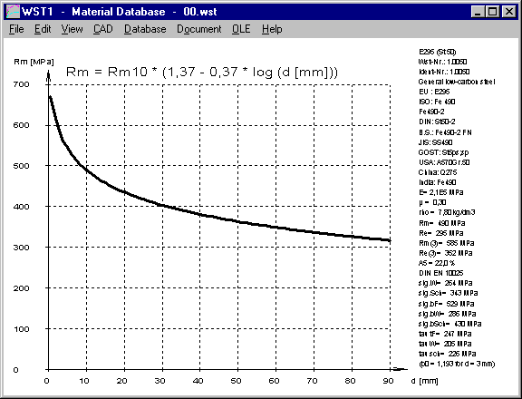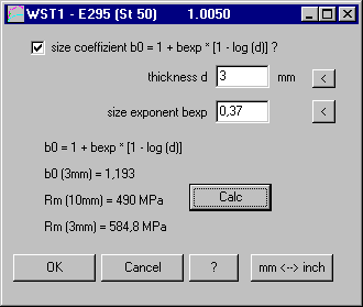 Until now, WST1 calculated size factor for material groups 1 to 27 (steel) to the formula b0=1+0.2*[1-log(d)]. Material properties of the database are based on material thickness (material diameter) of 10 mm. Cause size factor for different materials and different heat treatment differs, now you can input material exponent for calculation of the size factor. First you have to hook on that size factor must be considered. Material exponent for steel lies between 0.1 and 0.4.