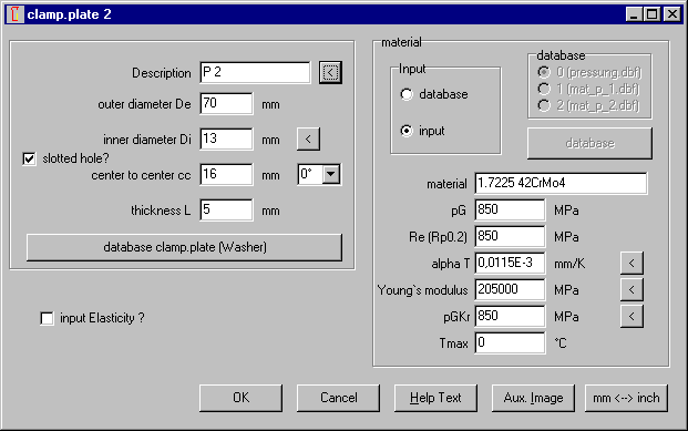 An oblong hole instead of a round hole can now be defined for the clamping plates: slot width Di and center-to-center distance cc (cc=0 is round hole).