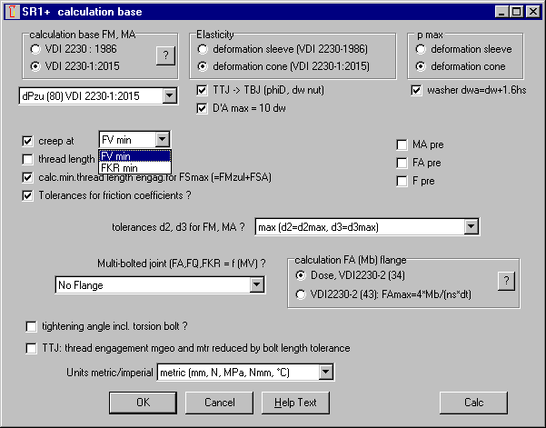 Until now, creep safety was calculated based on FKRmin. For creep safety SpKr=1, creeping until residual clamp load FKRmin was allowed. For safer calculations, better allow creeping until minimum preload FVmin. Now you can configure if safety margin SpKr will be calculated with FKRmin or FVmin. Default setting is FVmin.