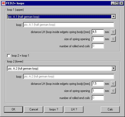 New suggest buttons "<" for input of loop distance LH and size of spring opening have been added. FED2+ suggests input dependent of selected loop type and inner coil diameter Di.