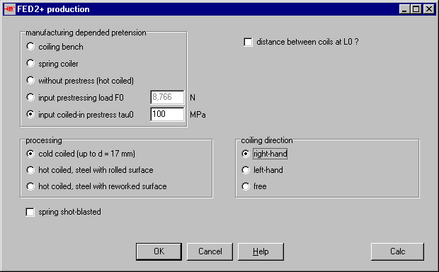 FED2+ calculates in-coiled prestress load F0 according to EN13906-2 (produced by coiling bench or spring coiler), or set to 0 (if distance between coils or hot-rolled), or input F0 directly. As additional option, you can enter prestress tau0 in MPa now.
