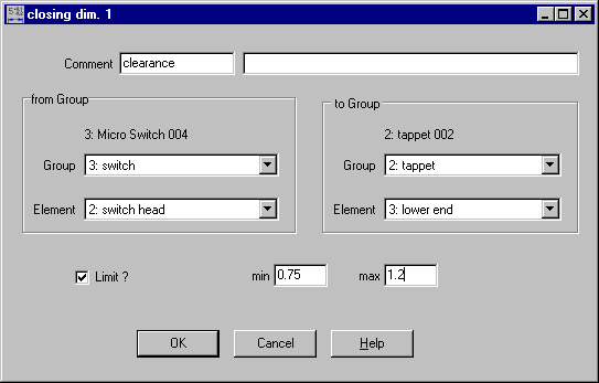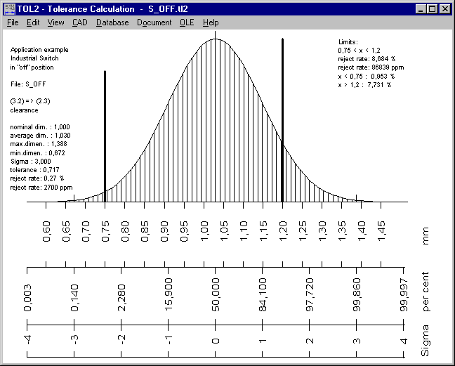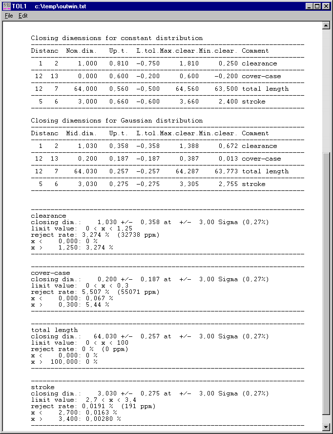 In the same way as in TOL1, you can now enter limits for each closing dimension, and TOL2 calculates reject rate. Standard printout lists reject rates for the predefined limits, and "Gaussian Graphic" plots predefined dimension limit and lists reject rates relative to limit.