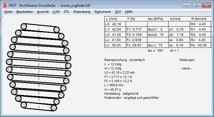 Die Federkennlinie der Zugfeder wird durch konische oder tonnenförmige Windungsabschnitte keineswegs progressiv, wie von GUTEKUNST fälschlicherweise in einem Zeitungsartikel behauptet (Hanser Konstruktion 5/2017). Die Federkennlinie ist sogar leicht degressiv, wenn die Windungen mit kleinerem Windungsdurchmesser infolge höherer Vorspannkraft F0 länger anliegen. Die Federrate von Zugfedern beliebiger Form kann man mit FED7 berechnen: Es ist die Federrate R0. R0 ist hier aber nicht die Federrate am Anfang der Federkennlinie, sondern die Federrate am Ende der Federkennlinie, nachdem keine eingewundene Vorspannung mehr wirksam ist. Wenn die Vorspannung bei kleinerem Windungsdurchmesser größer ist, gilt am Anfang die Federrate der Windung mit dem größten Windungsdurchmesser.