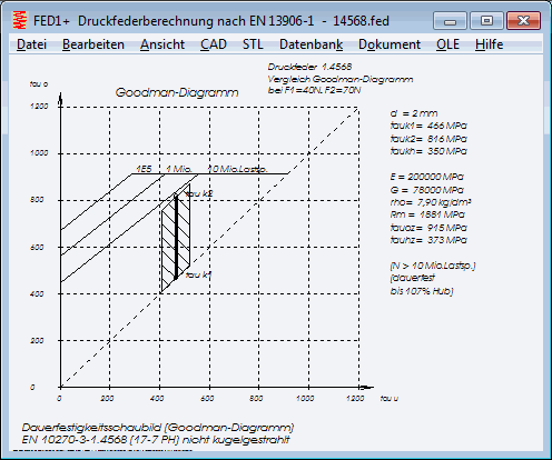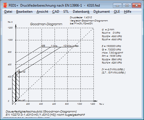 In der Beispielberechnung mit F1=30N und F2=70N ist der Unterschied im Goodman-Diagramm deutlich erkennbar. Die Feder aus 1.4568 ist dauerfest, während die Feder aus 1.4310 nach 300.000 Lastspielen bricht.