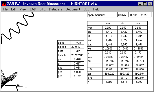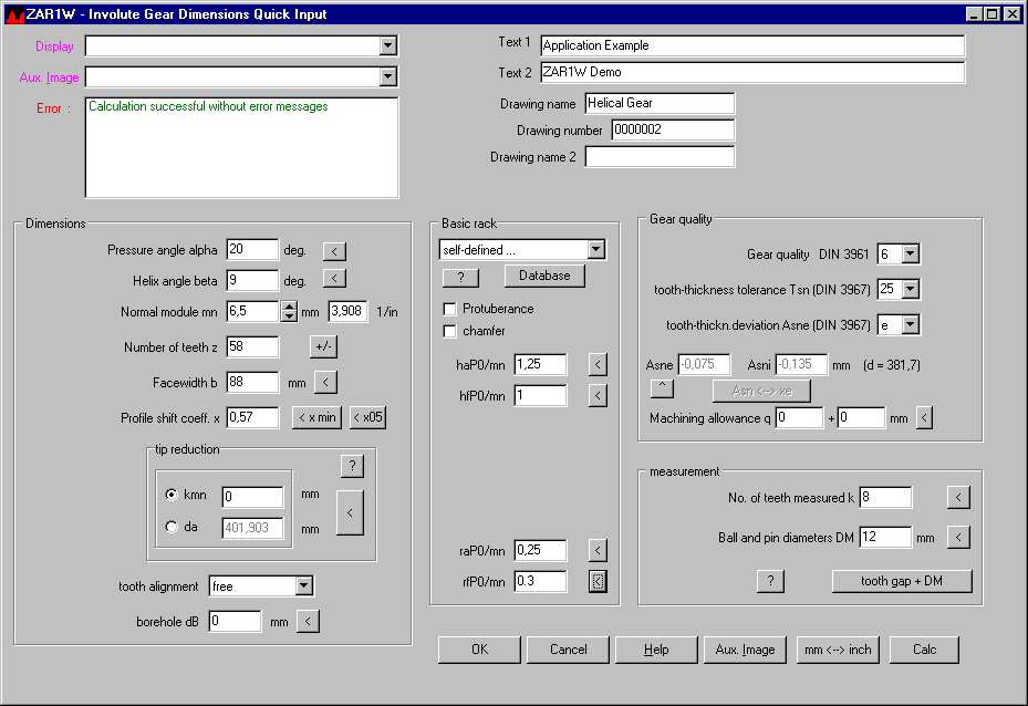 ZAR1W calculates dimensions and tolerances of one gear wheel. Other as in ZAR1+, in ZAR1W you calculate one gear wheel, no gear pair. No center distance, no strength calculation. ZAR1W is well suited for gear manufacturers, few input data are enough to get all dimensions and a profile drawing. New in ZAR1W is Quick Input with all input data in one dialogue window. With "Calc" button or "Enter" key, gear wheel is recalculated and result graphic is actualized in the background window.