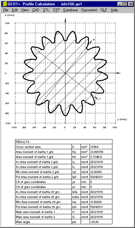 By inserting teeth as block into the drawing, gear wheels not always were drawn in one curve. This cannot be seen in the drawing, but if you convert the profile drawing into CNC code this can be used without optimization now. By means of our DXFMAN software, tooth profile can be converted into one polyline, to be used in GEO1+ for example to calculate area, mass and area moments of inertia.