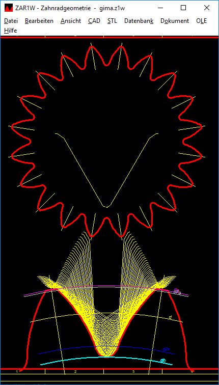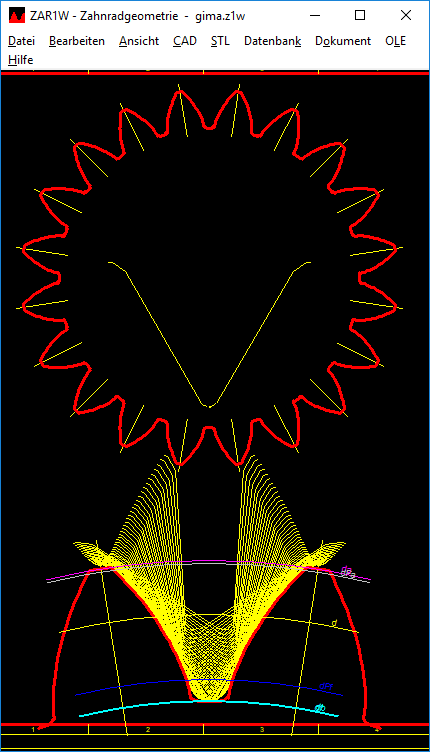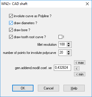 If the option "Draw tooth root curve" is set under "CAD-> Settings", then the trochoide curve generated by cutting tool will be drawn in case of undercut. Without undercut, fillet of the cutting tool is drawn. In rare cases (for "lace" gearing tools with a low frontal tooth width) there is a gap between the cutting tool shape (yellow) and the tooth fillet curve (red) in this drawing. For this case there is now a second checkbox (!) on the right, then a trochoide curve is always drawn. However, this option is not suitable as a permanent setting because, for example, involute splines according to DIN 5480 are drawn with a spike. Sometimes (but not always) helps in this case to increase the fillet resolution setting.