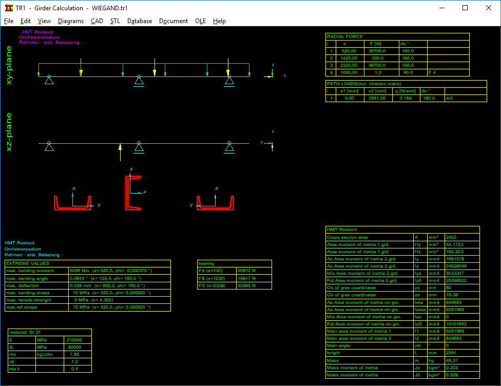 Quick3 View and Quick4 View has been added to girder software TR1 with drawings of cross-section, bedding and loads, tables with input data and calculation results, altogether on one screen.