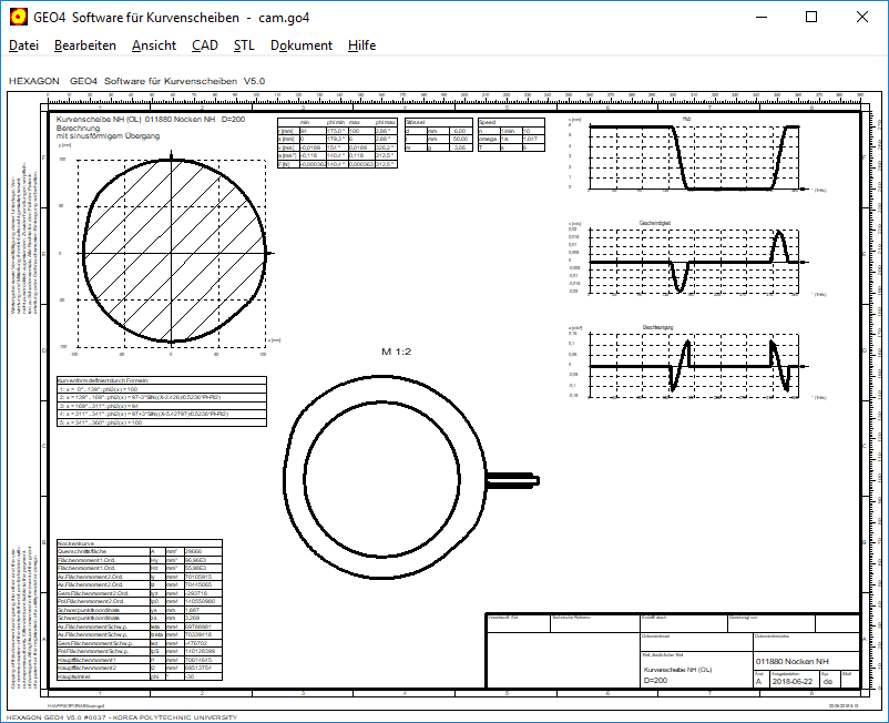 Für Nocken und Unrundzahnräder werden Fläche, Flächenträgheitsmomente und Schwerpunktkoordinaten berechnet. Berechnung und Tabelle wurde aus GEO1 übernommen.