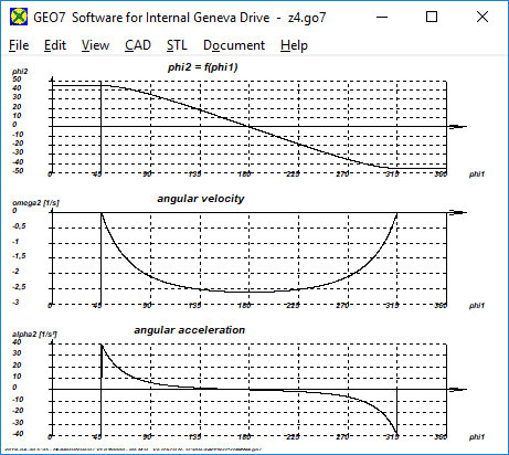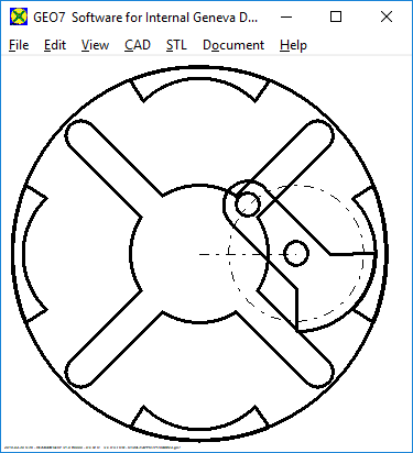 GEO7 calculates stepper gear with internal Geneva wheel. Interior Maltese have a long switching time and a short rest time compared to external Maltese gears. In a 4-beem external Geneva gear, the switching angle is 90 ° and the locking angle is 270 °. In case of an internal Geneva drive, the reverse is true: switching angle 270 ° and locking angle 90 °.
